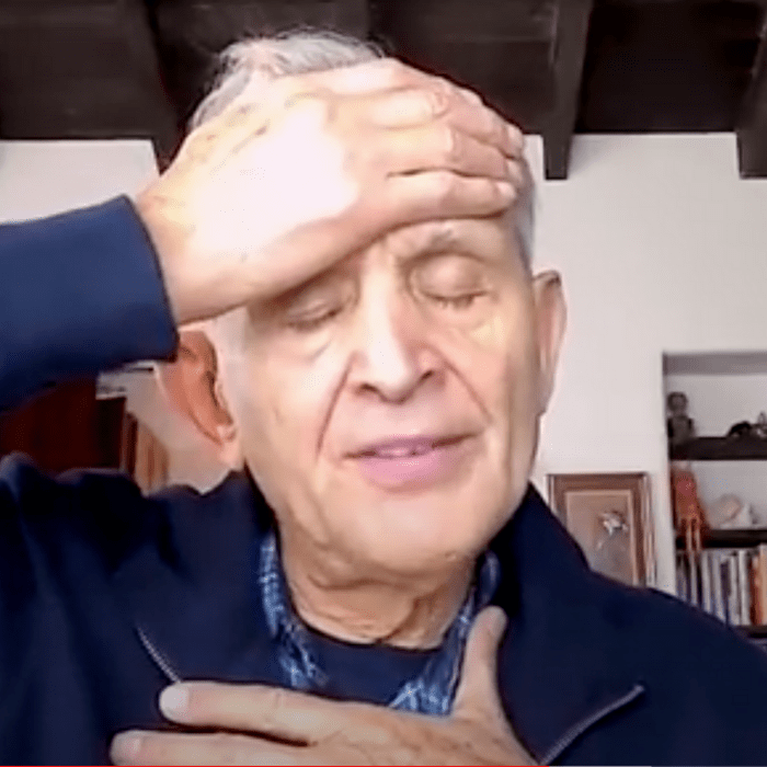The Trauma Hold, as described by Peter Levine, is to support coming back into the ‘container of the body’ when the mind or emotions feeling overwhelming. It can help to bring a feeling of safety and care. The right hand is placed under left armpit, left hand is around the right shoulder. Just breathe here and feel into the body. I highly recommend Peter Levine’s work.