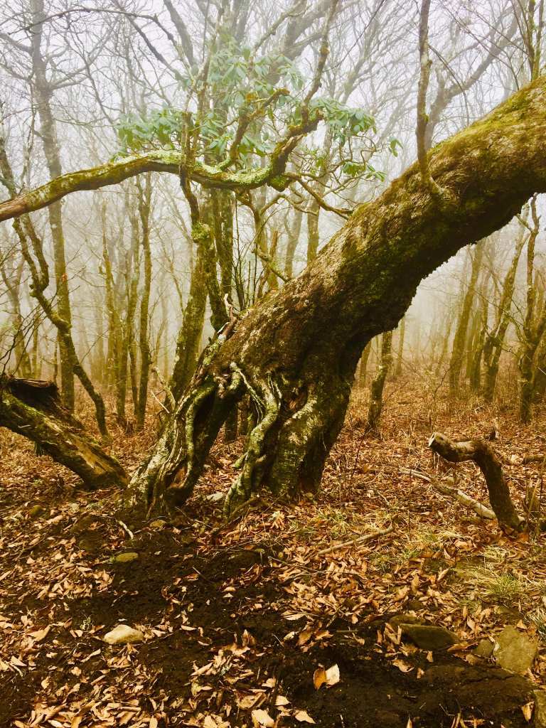Hiking on a mountain trail enveloped in clouds on a cold nearing Winter Day. The bare trees holding a beauty that somehow combined movement, grace, texture, and shades of varying color all at the same time. Majestic presence that tell stories of communion and dance with the elements and seasons. An energetic resilience that conveys without words.
