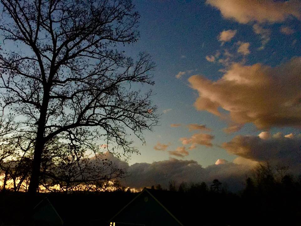 And then, as the storm passed and all was quiet the dogs and I stepped out into a world of fresh moisture laden air, fallen limbs from trees, water soaked earth….and the most glorious celebration of light and sunset clouds.
